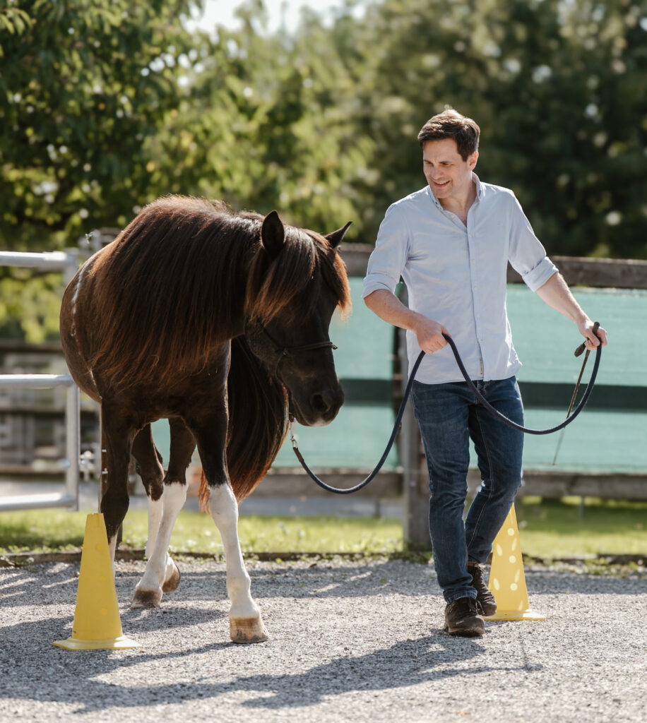Die Reaktionen des Pferdes, Deine Eindrücke und die Beobachtungen des Coaches bilden die Basis, um persönliche Themen zu analysieren. Neue Lösungswege werden direkt am Pferd überprüft, trainiert und gefestigt.